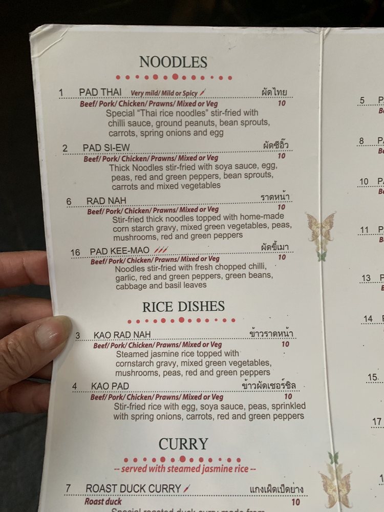 Thick noodles stir-fried with soy sauce, egg, peas, red and green peppers, beansprouts, carrots and mixed vegetables