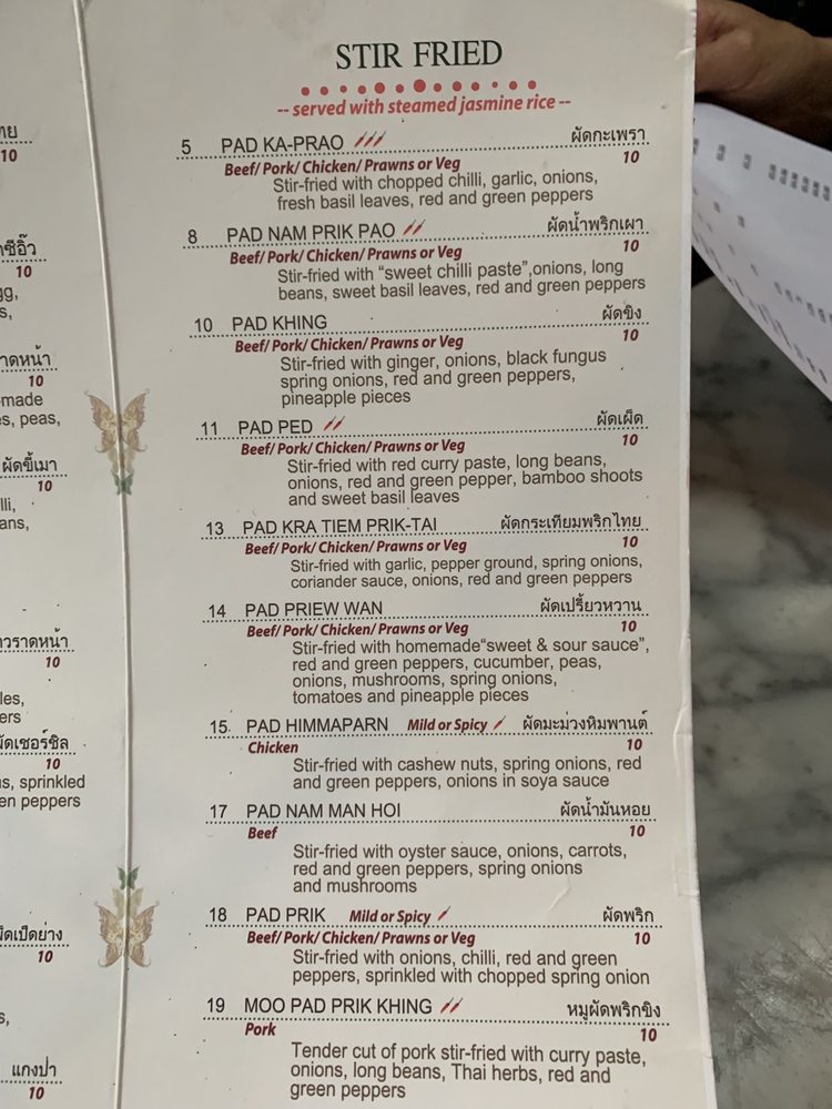 Pork only Tender cut of pork stir-fried with curry paste, onions, long beans, Thai herbs, red and green peppers
